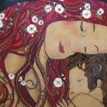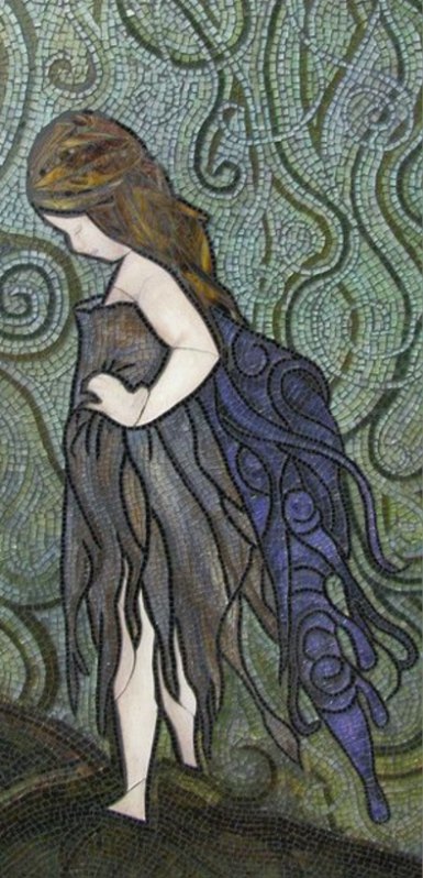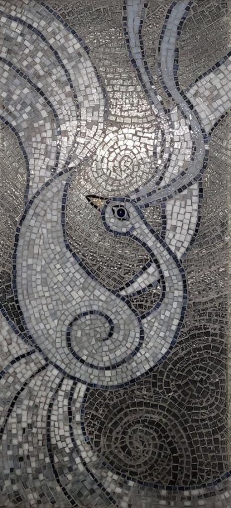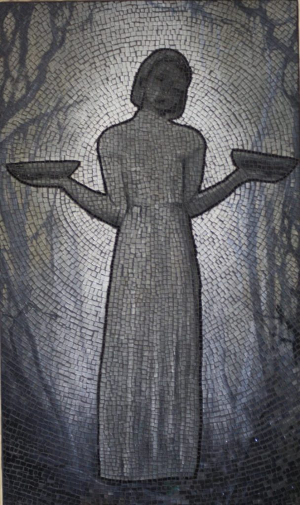 Picture of mosaic glass on wood of Skull and owl